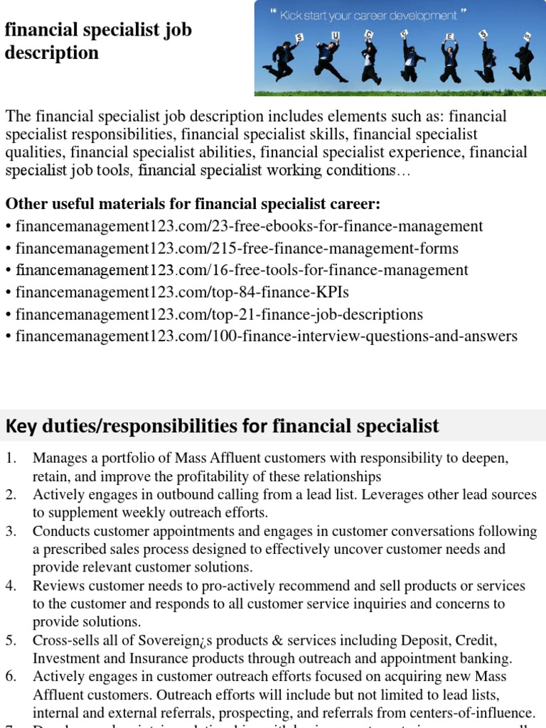 Financial specialist responsibilities, financial specialist skills, financial. Financial specialist job description template. The services rendered by accounting specialists are required by a number of business organizations, like accounting companies, banks, and other related business. Financial services workers offer their fiscal expertise and knowledge to help their. Customer service specialists provide a positive brand experience for existing and potential customers.
